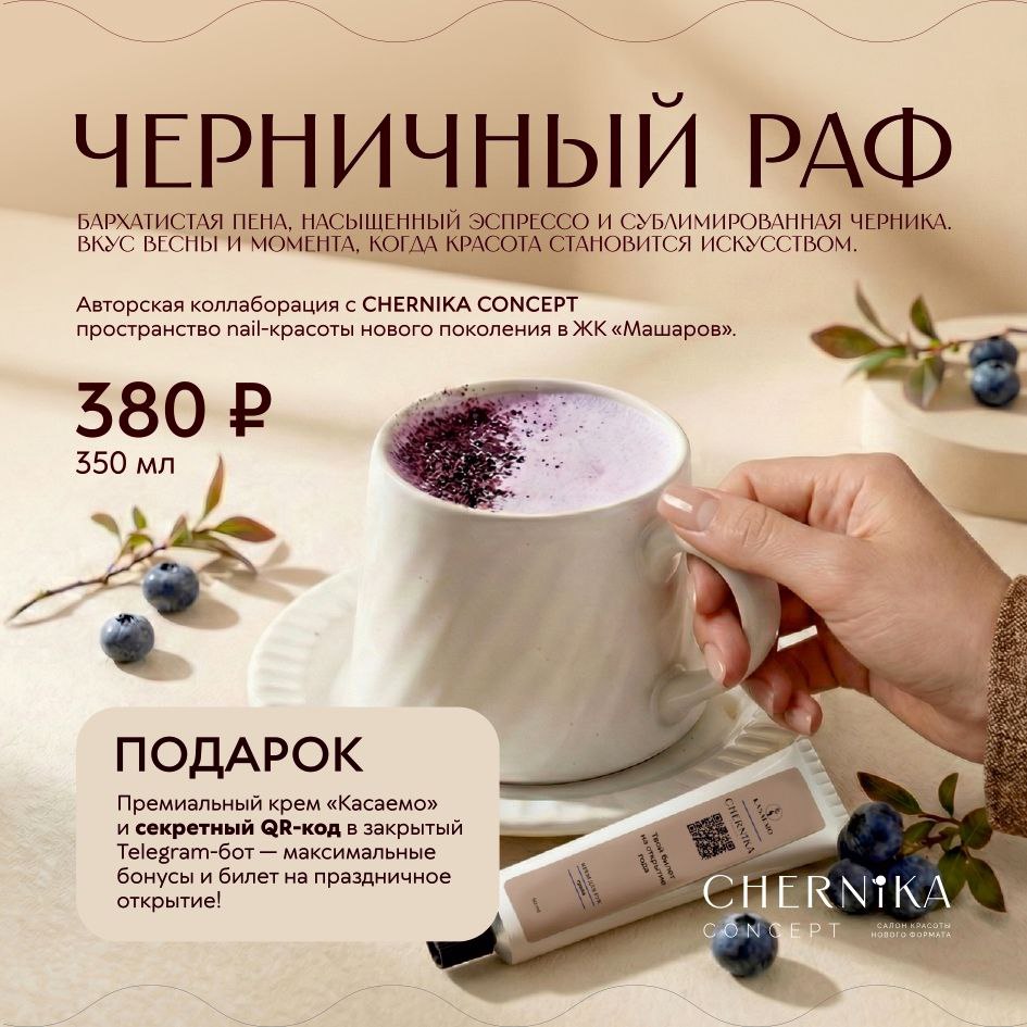 Закажите черничный раф в сети кофеен «Делюсь добром» и получите крем для рук в подарок с секретным QR от CHERNIKA CONCEPT 🫐☕️